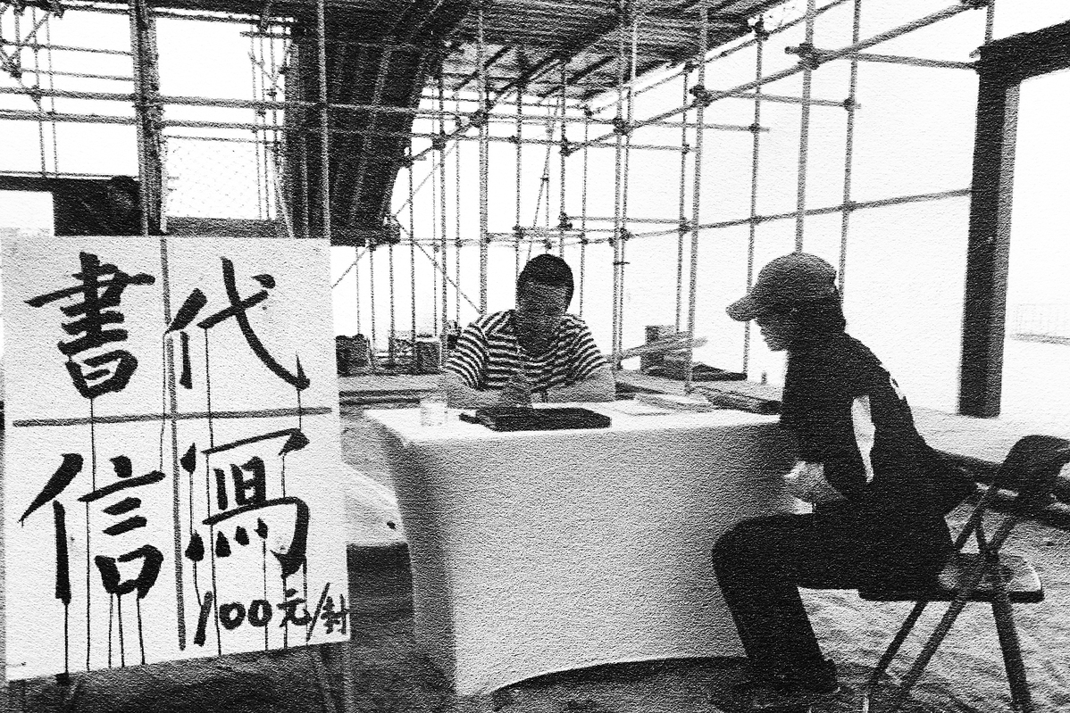 A photo from an exhibit at the China Museum for Fujian-Taiwan Kinship in Quanzhou, Fujian, shows a man offering a ghostwriting service to a client in Fujian. [Photo provided to China Daily]