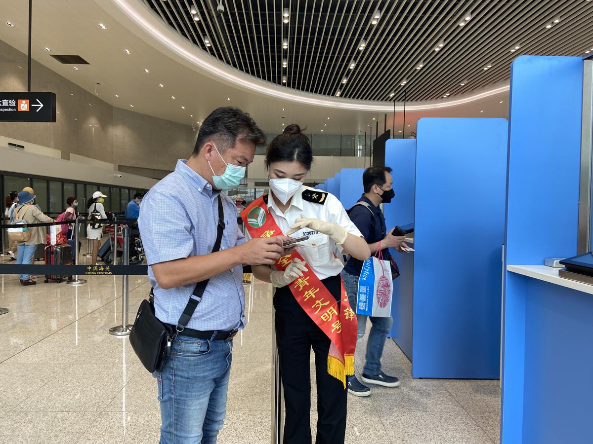 On Jan 7, Xiamen customs officers provide clearance operation guidelines for passengers. [Photo by Ge Liang/ For chinadaily.com.cn]