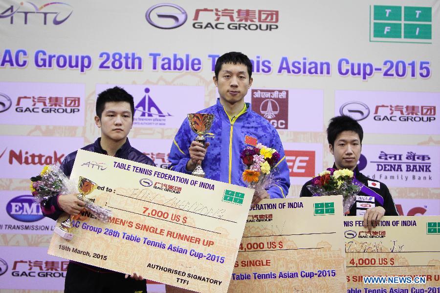 Xu Xin (C) of China, Fan Zhendong (L) of China and Mizutani Jun of Japanattend the award ceremony at the 28th Table Tennis Asian Cup in Jaipur, India, March 15, 2015. Xu Xin won 4-3 to claim the title. (Xinhua/Zheng Huansong)